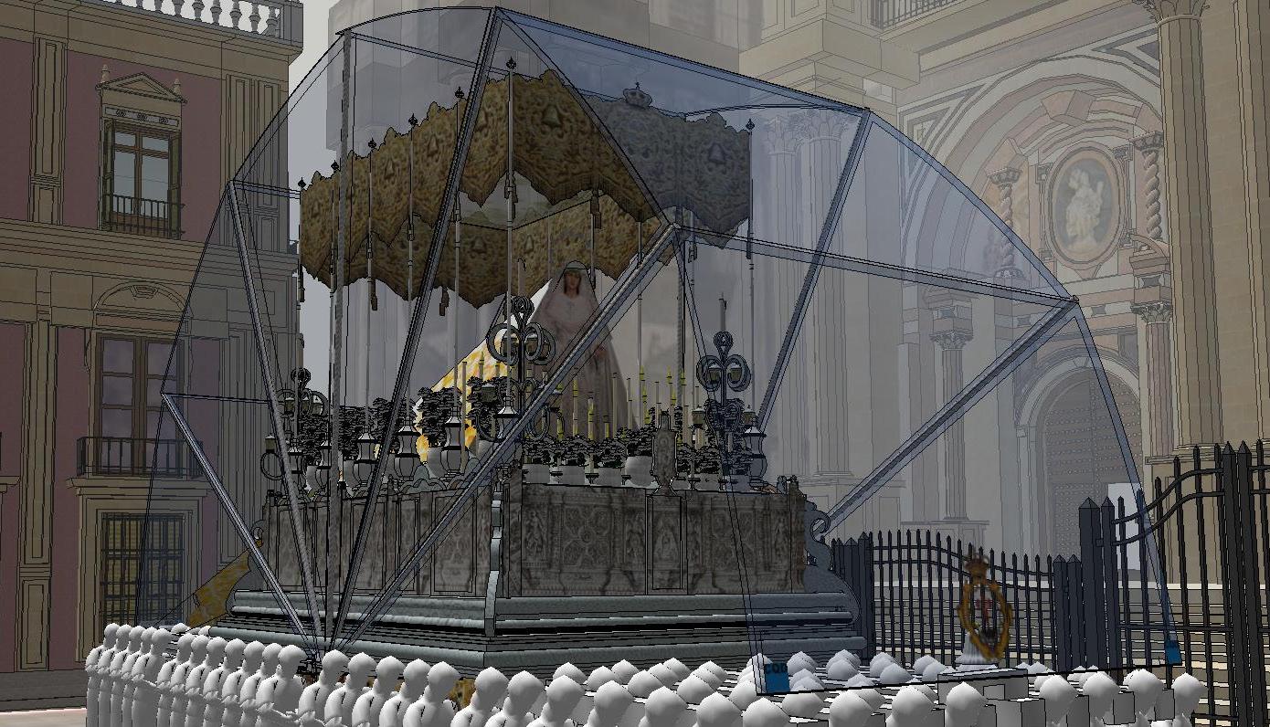 Bajo la cubierta, compuesta de techo y opcionalmente con protecciones laterales, quedarán resguardados todos los elementos del trono, incluidos el manto de la Virgen, los arbotantes y los varales, de extremo a extremo. Así, a la vista del público quedará como un “paraguas” para que se puedan continuar observando las sagradas imágenes, mientras que el trono se desplaza sin ninguna dificultad.